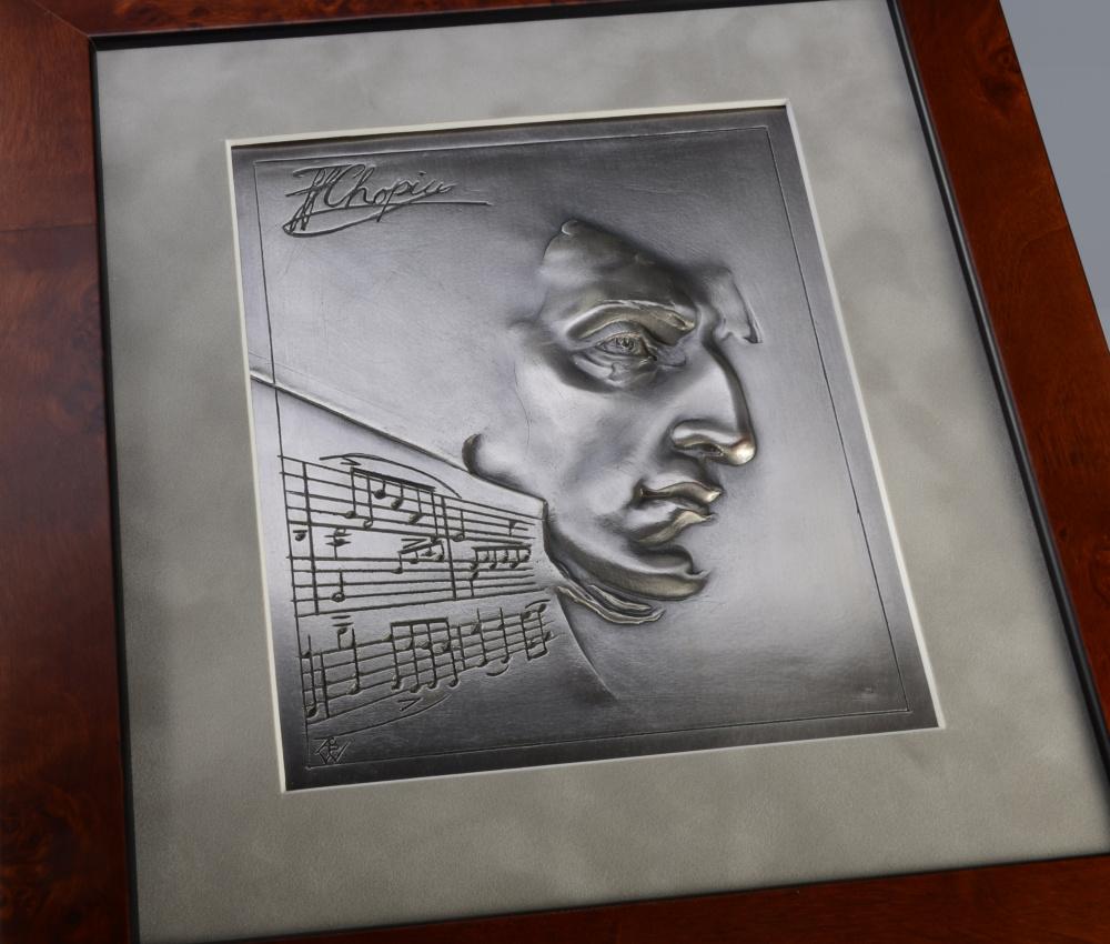 Portret Fryderyka Chopina - płaskorzeźba wykonana z metalu pokrytego srebrem, oprawiona w drewnianą ramę z flokowym passepartout. Doskonały prezent dla melomana, może być również przepiękną pamiątkową nagrodą w konkursie muzycznym.