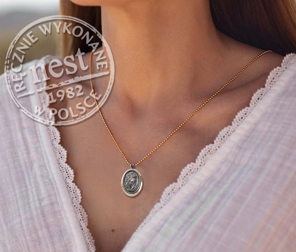 Wisiorek z klasycznym, subtelnym motywem kamei wykonany ze srebra z elementem pokrytym złotem, co pozwala skomponować go zarówno ze złotą jak i srebrną biżuterią.