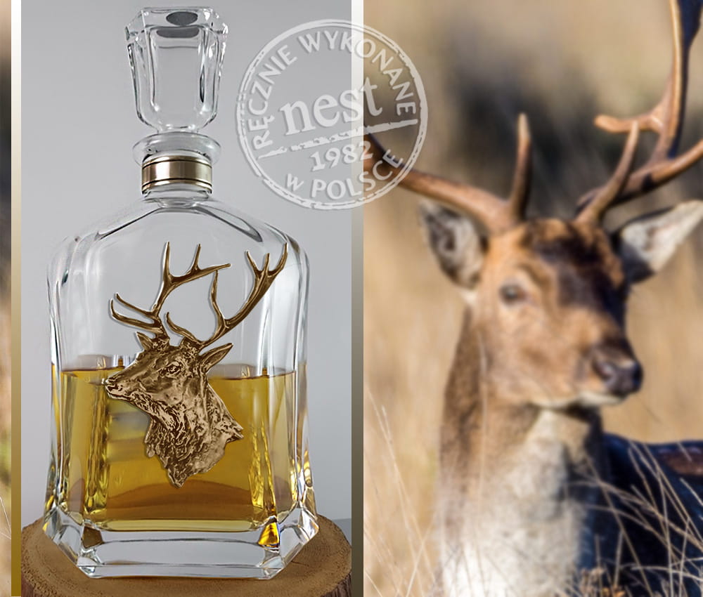 Karafka do whisky, wódki lub nalewki szklana, z rzeźbą jelenia z brązu. Doskonały upominek dla mężczyzny łączącego w sobie zarówno miękkie, delikatne cechy, jak i siłę i determinację.