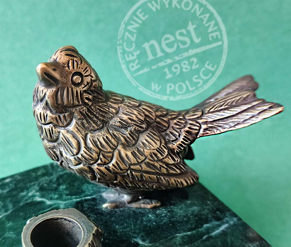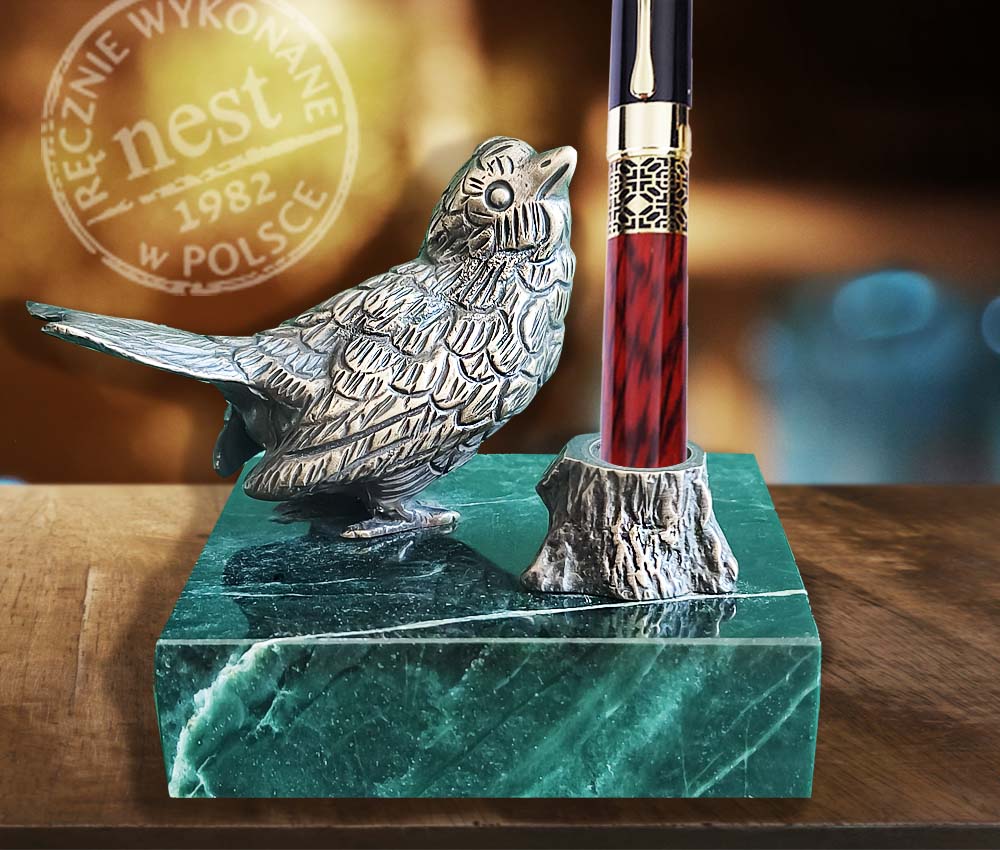 Podstawka na pióro lub długopis z rzeźbą ptaszka z brązu na marmurowej podstawie. Idealny drobiazg dla miłośników natury.