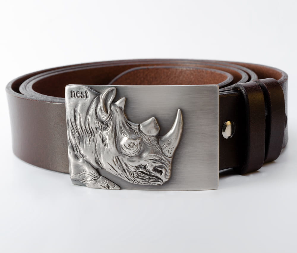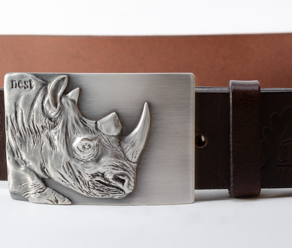 Ręcznie wykonany, skórzany pasek z ozdobną klamrą z brązu pokrytego srebrem ozdobioną aplikacją w formie głowy nosorożca - oryginalny dodatek do męskiego stroju. Idealny prezent dla męża, dziadka lub szefa. Kolor skóry czarny lub brązowy do wyboru.
