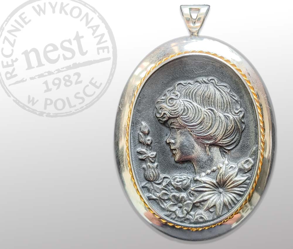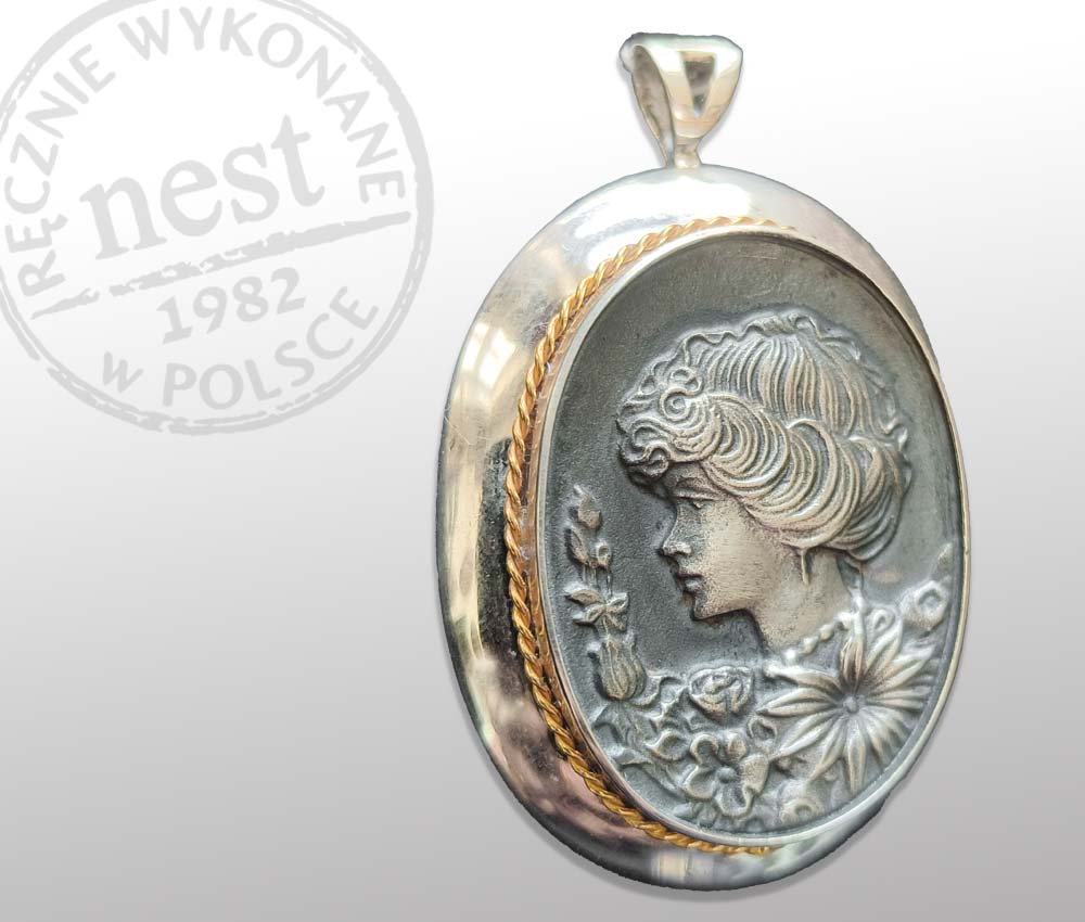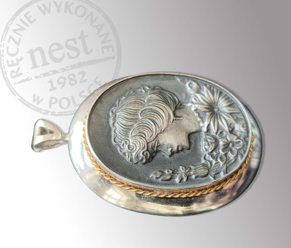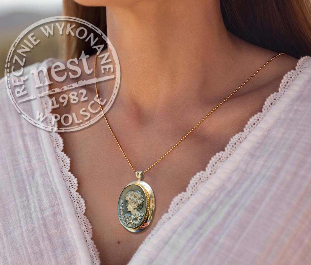 Wisiorek z klasycznym, motywem kamei wykonany ze srebra z elementem pokrytym złotem, co pozwala skomponować go zarówno ze złotą jak i srebrną biżuterią.