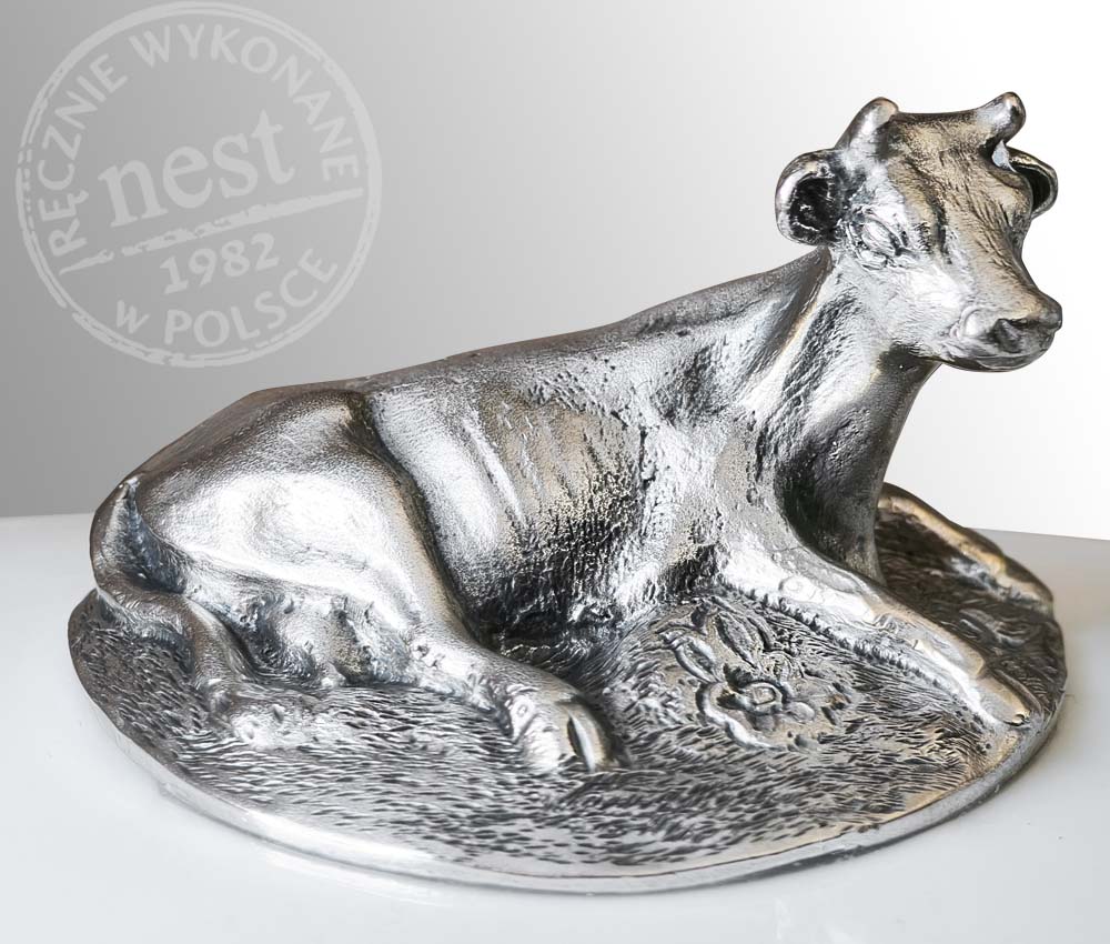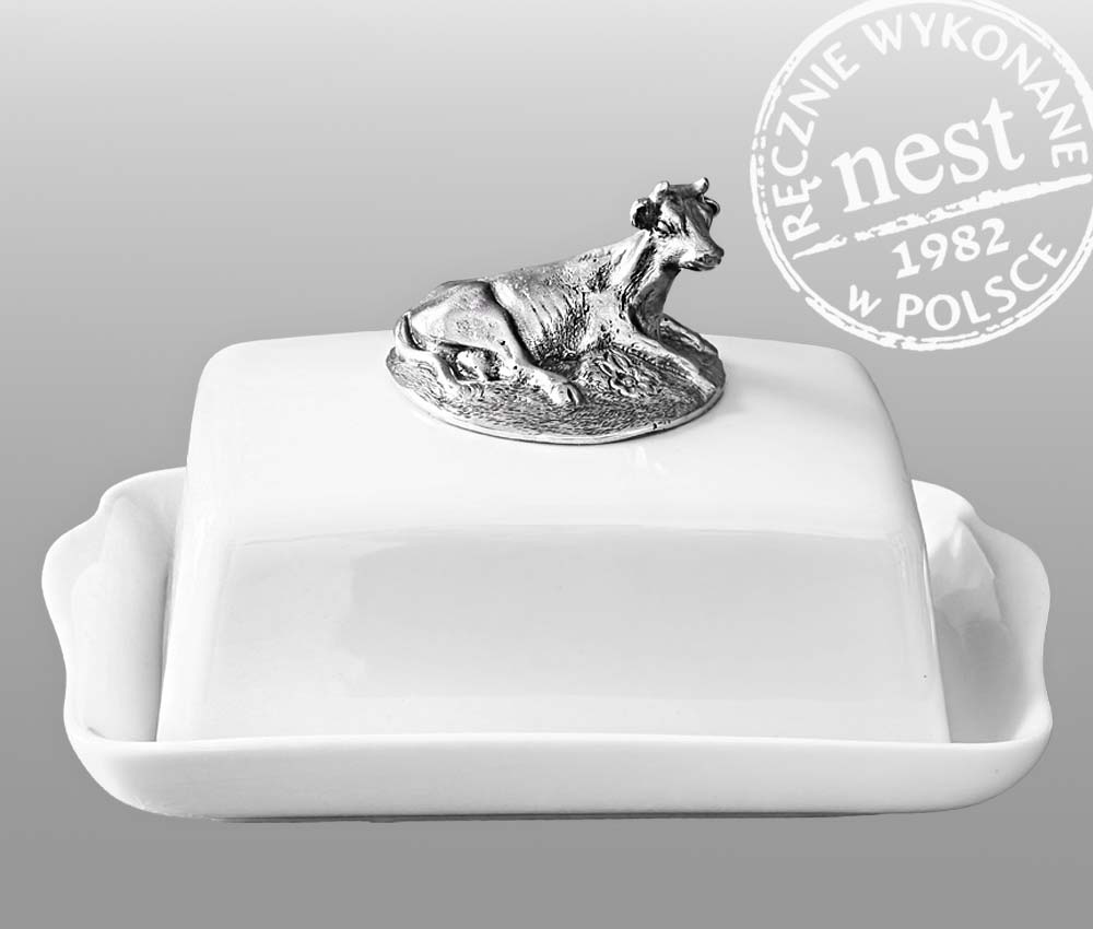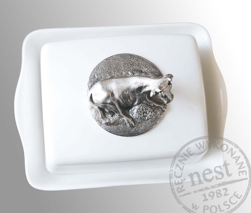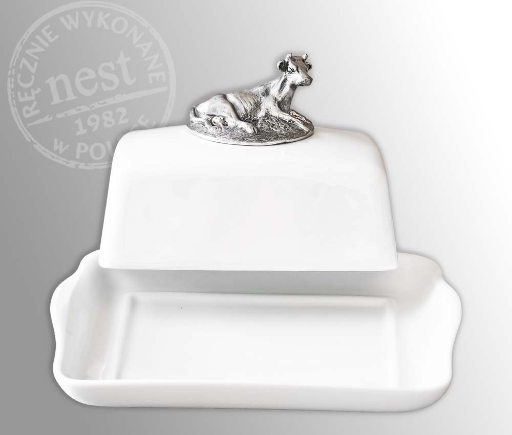 Funkcjonalna, ozdobna maselniczka z autorską rzeźbą krowy. Przedmiot doskonale zdobiący stół podczas porannego śniadania. Pasuje do standardowych kostek masła.