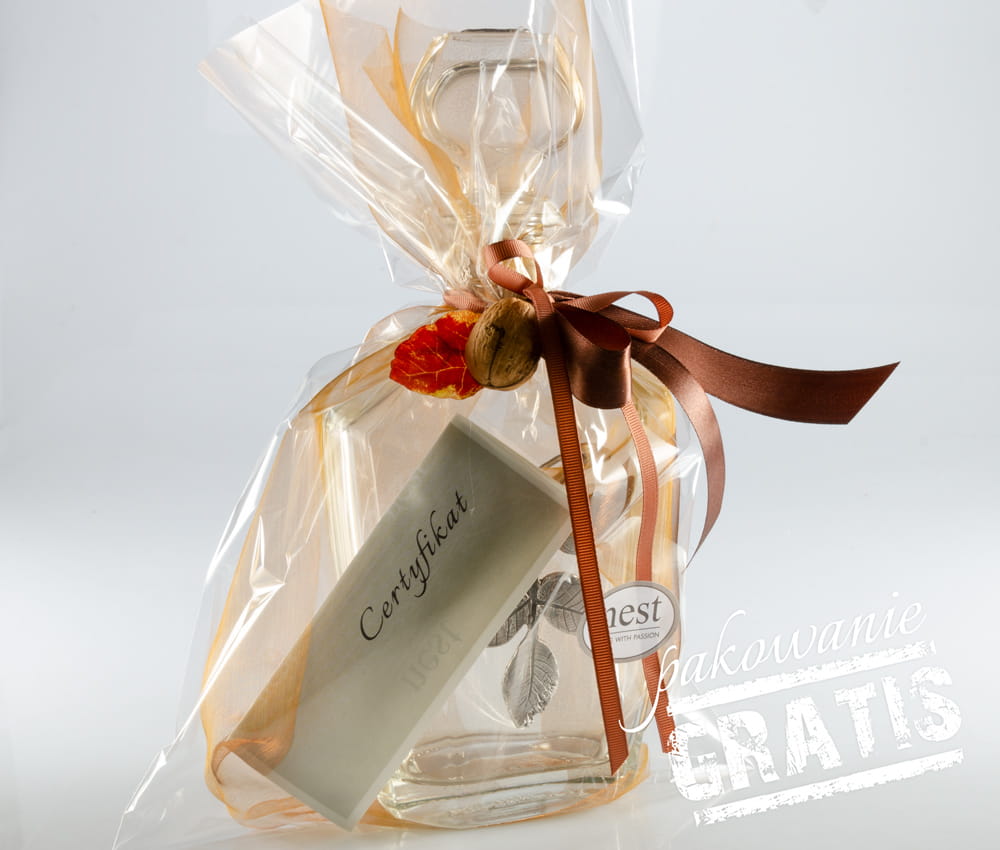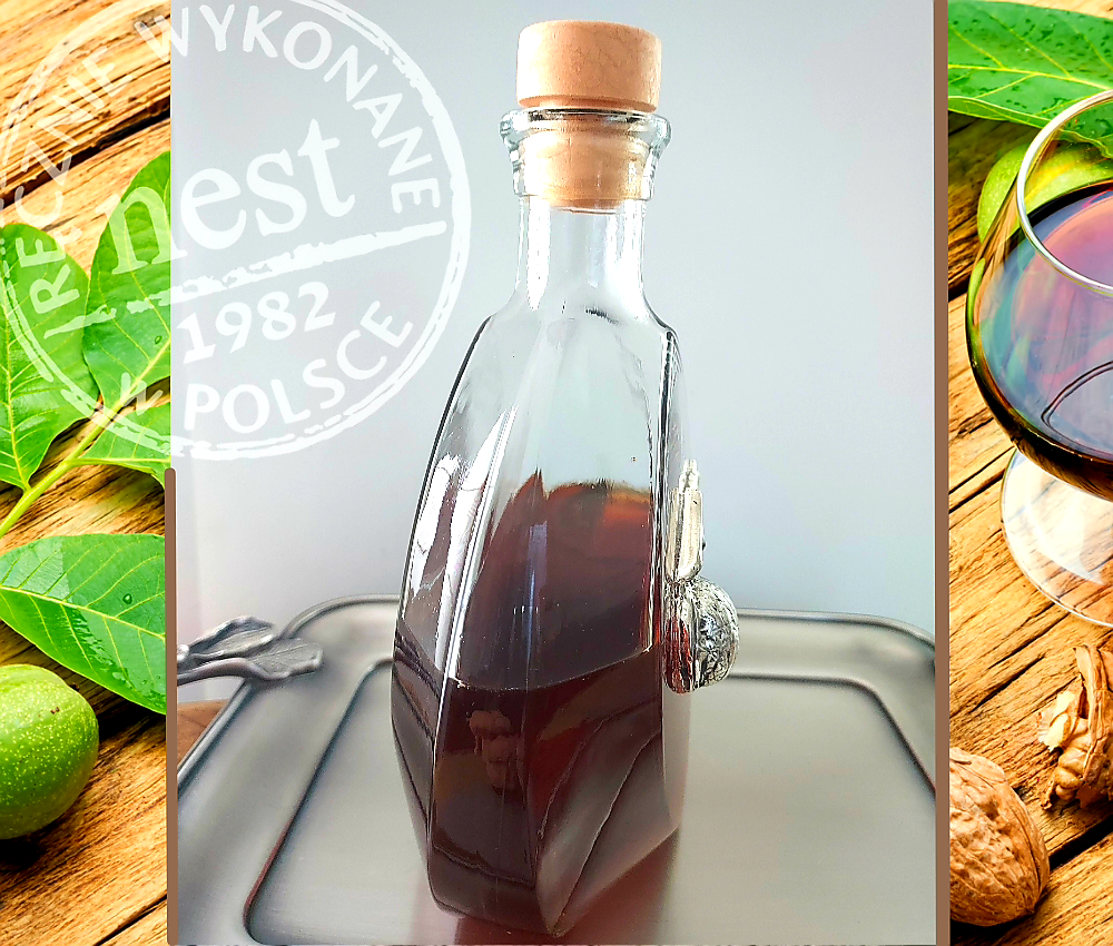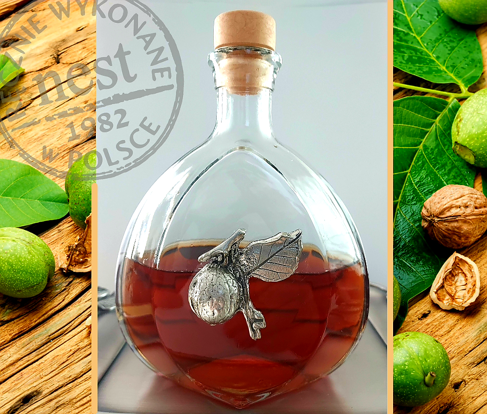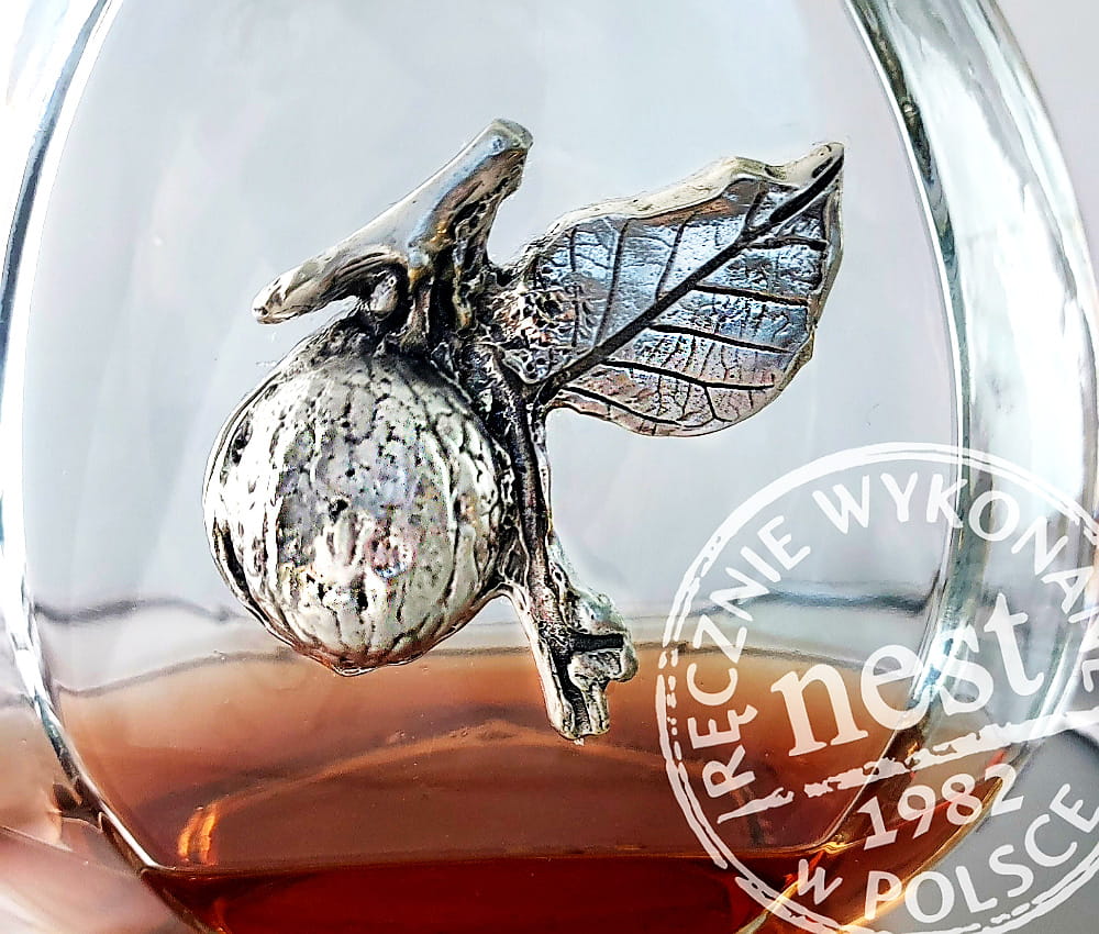 Orzechówka, znana nalewka o właściwościach zdrowotnych jest chętnie wytwarzana w warunkach domowych. Oryginalną karafkę do nalewki orzechówki ozdobiliśmy ręcznie wykonanym motywem gałązki orzecha. Aplikację wykonaliśmy z brązu i pokryliśmy srebrem najwyższej próby. Artystycznie ozdobiona karafka będzie się świetnie prezentowała na każdym stole a orzechówka będzie wyjątkowo smakowała. Polecamy jako prezent dla miłośników domowych nalewek, likierów jak również domowych producentów tych trunków. W zestawie z kieliszkami do nalewek to doskonała propozycja na prezent dla dziadków, rocznicowy dla pary lub prezent imieninowy dla solenizanta.