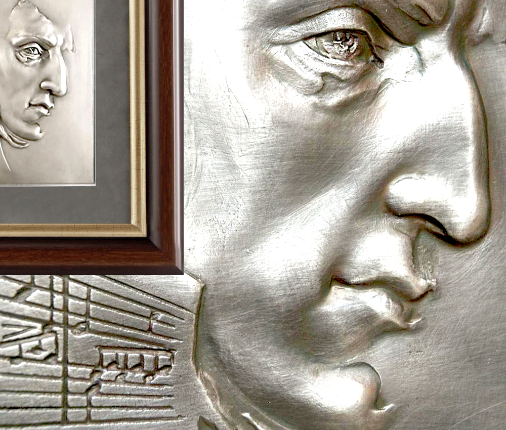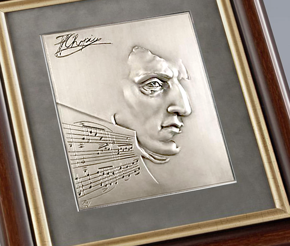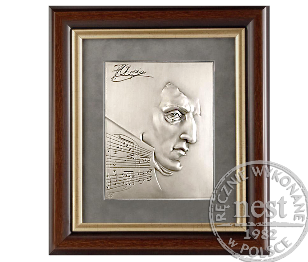 Fryderyk Chopin nazywany poetą fortepianu. Portret tego najsłynniejszego z pianistów wykonaliśmy z metalu pokrytego srebrem. Oprawiliśmy w drewnianą ramę w kolorze brązu i złota, z flokowym passepartout. Doskonały prezent dla melomana, może być również przepiękną pamiątkową nagrodą w konkursie muzycznym.
