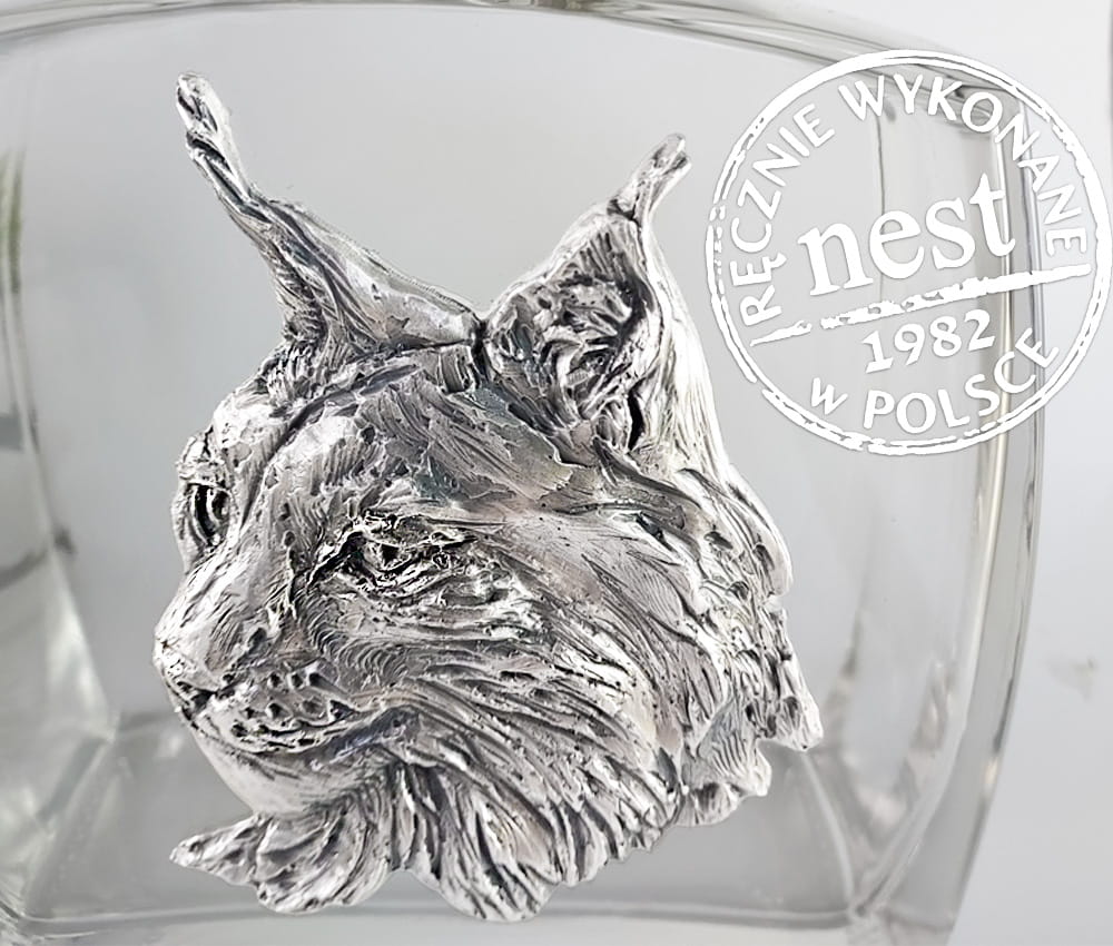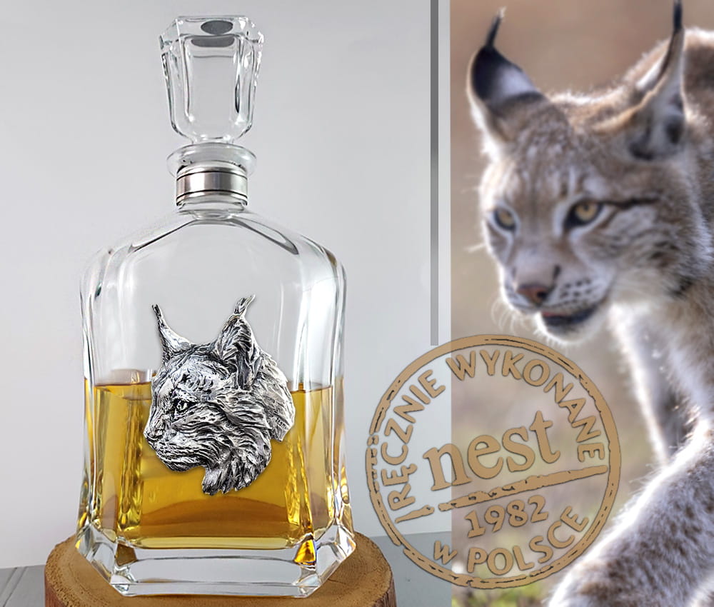 Wyjątkowa szklana karafka z dekoracyjną płaskorzeźbą w kształcie głowy rysia. Autorską płaskorzeźbę rysia wykonano z brązu i pokryto srebrem najwyższej próby. Znakomita do nalewek, wódki, whisky. Ciekawy prezent dla Ryszarda.