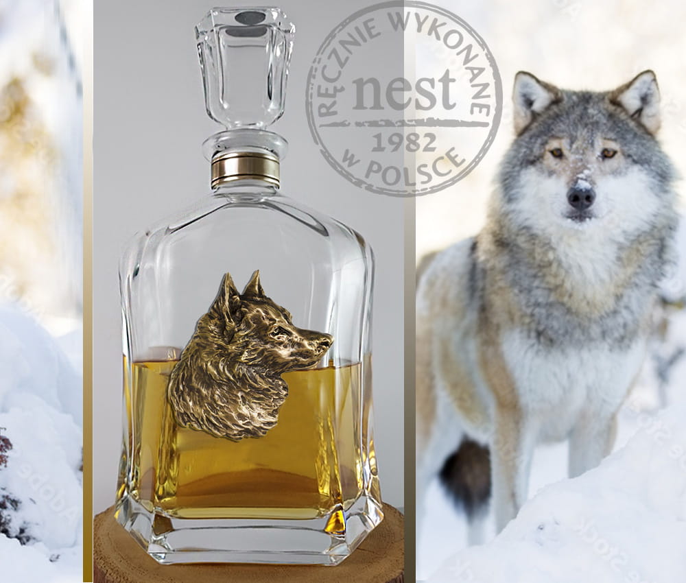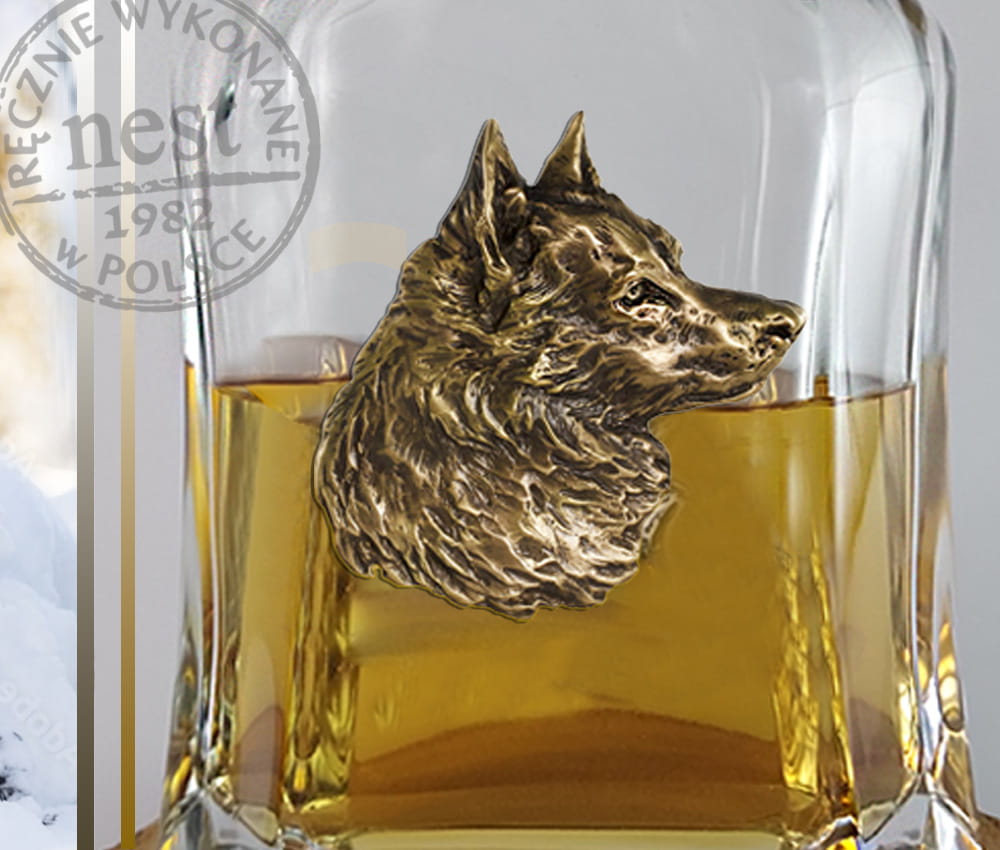 Szklana karafka do whisky, wódki lub nalewki z aplikacją z brązu w formie realistycznie wyrzeźbionej głowy wilka jest eleganckim prezentem dla każdego mężczyzny.